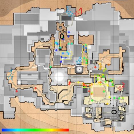 This shows the deaths of the attacking Team. Most deaths at the known chokepoints which get covered/crossfired by the defenders.