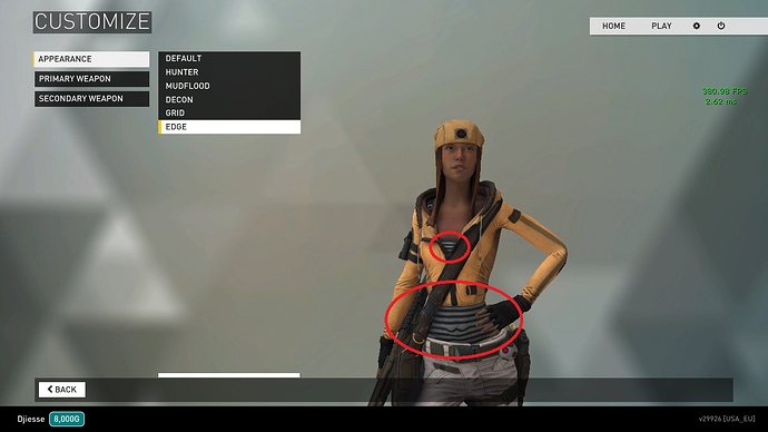 I’m not sure who decided that Aimee’s exposed midriff was too risqué (:rolleyes:), but the attempts at covering it are not all entirely successful. For the default and Edge skin, the stripes on the bottom part do not match those in her chest area (the bottom ones are wider) and also do a strange wave where her navel used to be (I’m guessing the geometry is not even, was her belly button modeled?)