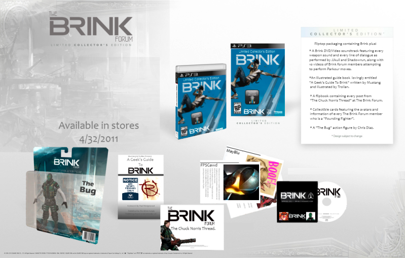 *A Brink DVD/Video soundtrack featuring every weapon sound and every line of dialogue as performed by JJKul and Shadowrun, along with 10 videos of Brink forum members attempting to perform Parkour moves.