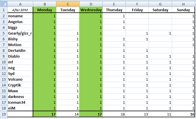 I took the liberty to evaluate the data posted here by everyone. According to the statements the chosen days to play are Monday and Wednesday from 8PM on (I have no idea which timezone is usually referred to in AUS, I suppose everyone used the same?). Thursday and Sunday only received one “vote” less and could be used if Monday/Wednesday don’t work out.