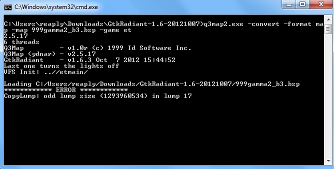 I am using GTKRadiant 1.6, and I place the .bsp file and the .bat file in the same folder as q3map2.exe. But when I run the .bat file the cmd prompt opens with: