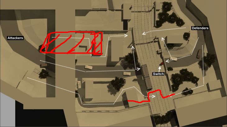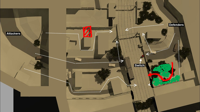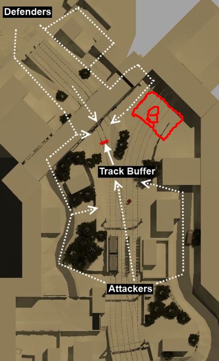 On the lower route I would offset the entrances onto the railtracks, just so the defence can’t hide in those bushes and shoot straight across into the heads of the attack who are coming up the hill, perhaps even add some cover on the middle track between the two with a flatbed train cart thingy, not the full height one that is near by, just something to crouch behind maybe, and just one of them.