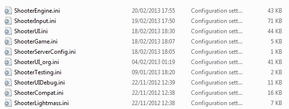 Since the patch today which is supposed to preserve config settings, instead it seems to reset them, bar the ones actually settable in-game (these are the files in Published\Content\ShooterGame\Config). It overwrites them as soon as the game starts (ignore shooterUI_org.ini - thats just my backup)