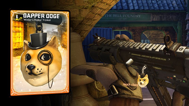 This gormless mutt bursts forth in fleurescent comic sans gimmickry with a yuletide howl when you inspect it. Kills you make with the Dapper Doge equipped are also highlighted in the obituaries for all players.