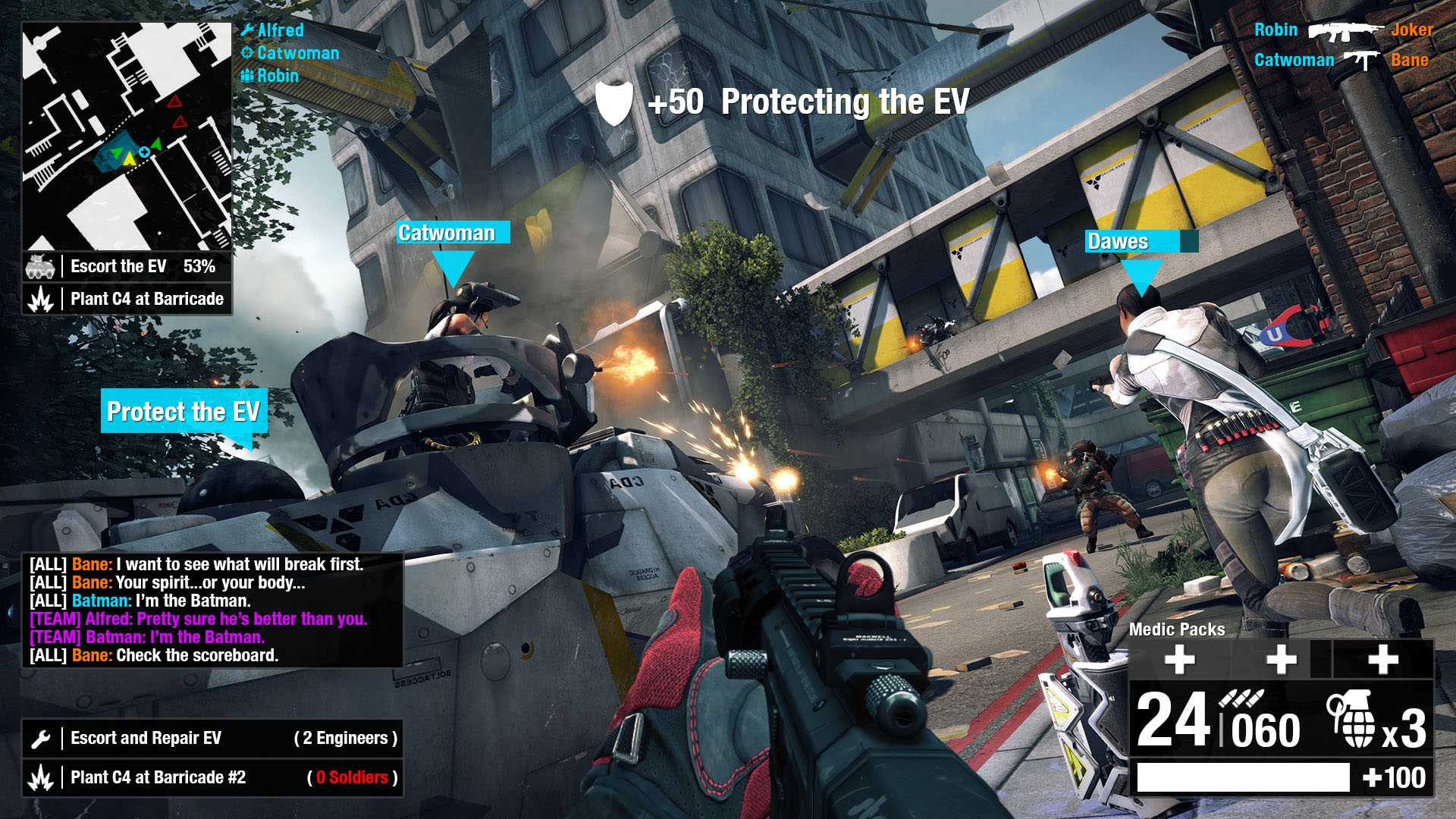 Across the center of the screen we have the traditional nameplates with Dawes showing damage taken. Also there is a bubble representing the EV needs protecting opposed to the giant, bright yellow diamond. Above the action is a notification that you gained XP with a shield for an icon. I like this above the action placement for such announcements as opposed to covering your screen.