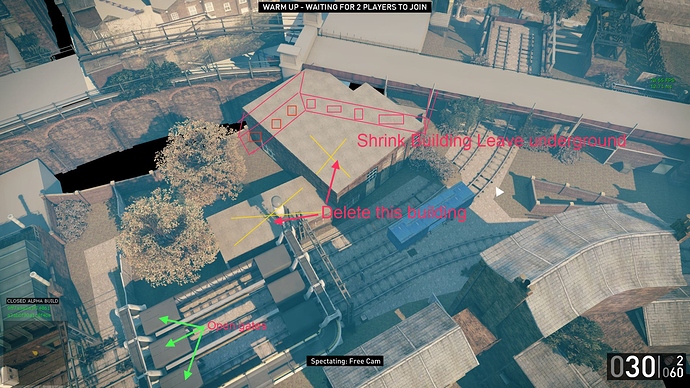 Now from the competitive point of view (although I haven’t played a match on the new Camden yet) I would predict, that the left side (from the attackers view) is a waste of time, because it’s a very long way and later all comes down to one single door which can be hold by one defender easily. I would always attack over right or main, but never over the left side.