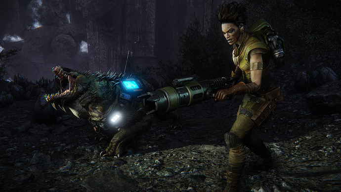 To say it out loud(which I’ve already done before); the character designs in DB are absolutely fantastic, but still too much grounded in reality(imo), whereas EVOLVE’s characters look almost exactly, like I would’ve wished them for DB. I understand, that EVOLVE’s weaponary could in no way(?) fit into the whole storyframe of DB, but it wouldn’t be too crazy to go at least half way in the direction of EVOLVE*. DB’s characters themselves are mostly futuristic enough imo, even though some could still use some sci-fi touches here and there; but what I’m really missing is more advanced and designed weaponary. I mean there are already real-life weapons out there, that look far more advanced than any of the DB guns, rifles and SMGs.