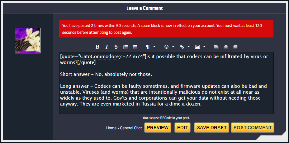 I was speaking generally, and I have a feeling things were taken out of context from what I actually said in my post to help the OP on that thread figure out what his issue could be. If he was indeed banned and it WAS anything I had said, that would give you guys loads of information that you could use. Sadly, that OP hasn’t responded. Almost indubitably he’s dropped DB, or the issue has been fixed and he’s too much of a jerk without realizing it to come and tell people he’s good. Only reason I posted this here is out of respect for what @Eox requested, and because I’m personally not trying to jump on the beat the dead horse band-wagon. It sucks about what is happening to both of you, but I have no definitive clue or surety anymore (because I’ve tried to help and not been able to) about what caused either of your guys’ problems with DB. There was a period of time where I was getting terrible glitching/hitching, and I made a video about that, but that was back before I started getting internet issues from my ISP and before the MOFO update.