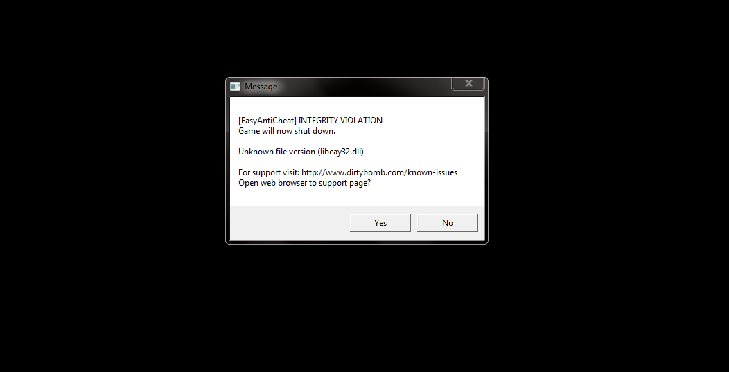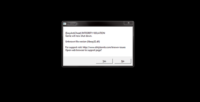 These are the checksums for libeay32.dll v1.0.1.3 that should be located at “<install path>\steamapps\common\Dirty Bomb\Binaries\Win32”: