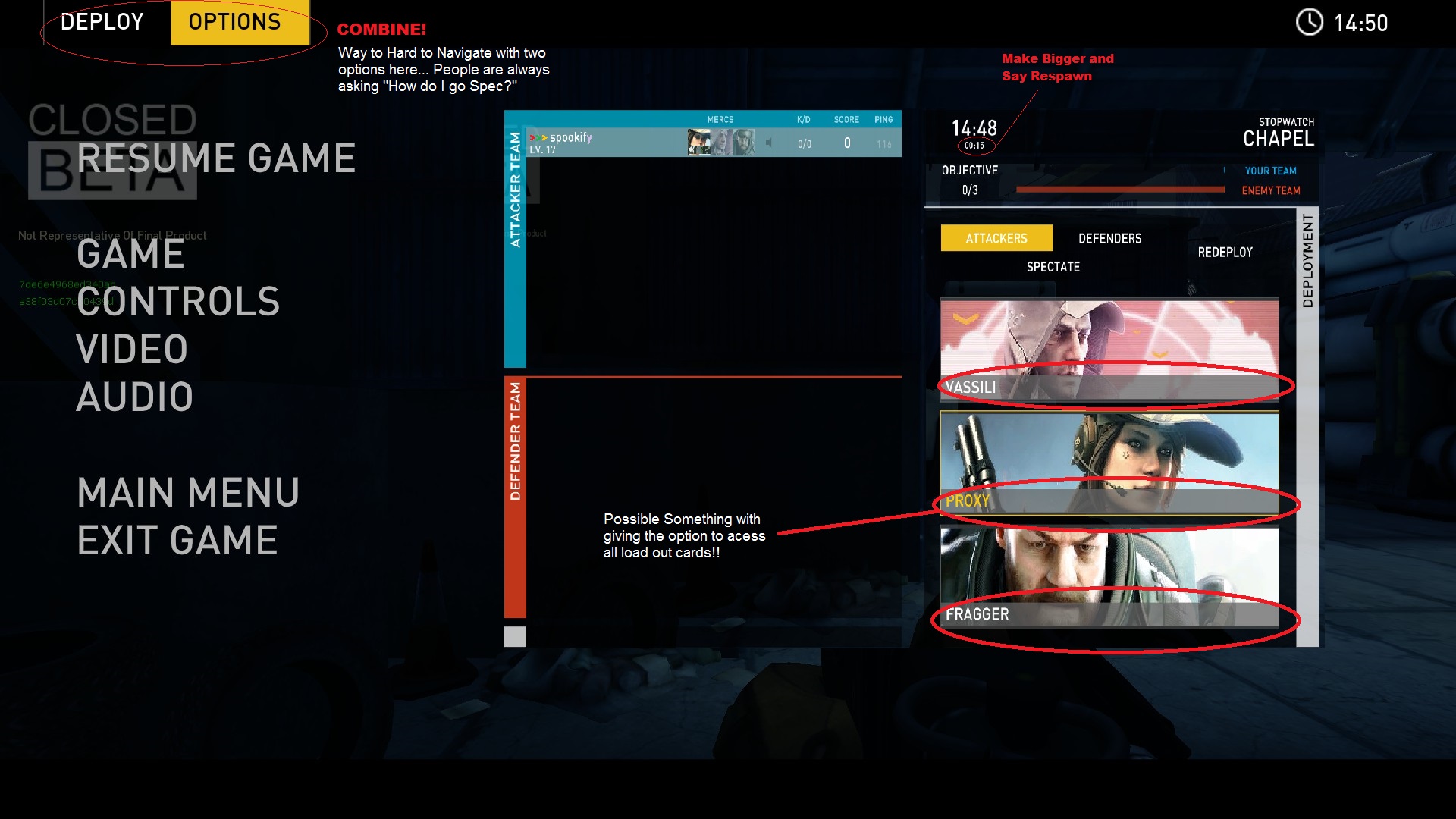 Next is the ESC Menu. This is very confusing an people are always asking “How do I go Spec?”. So the ESC menu looks really rough and should be combined with the Deploy menu!! Check it out: