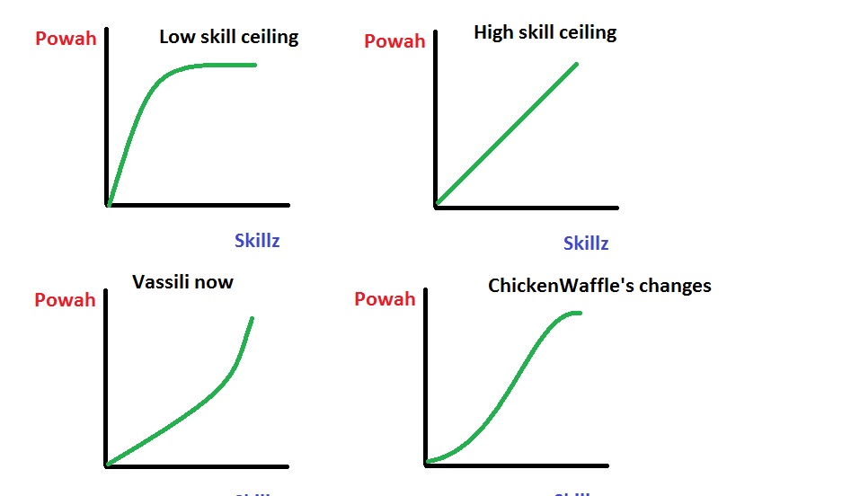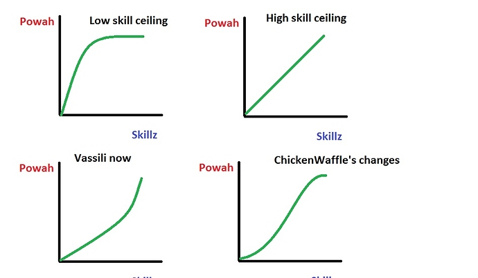 Vassili as is now: higher skill gives you high power levels, but the power level goes insanely high at the top levels, making vassili OP at that level.