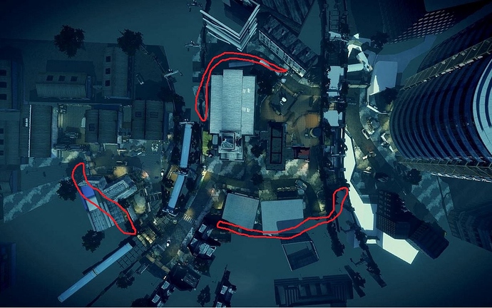 Looking at the map overview, there seems to be a lot of unused space. The 3 highlighted routes are what I am going suggest SD open up to make this map less linear.