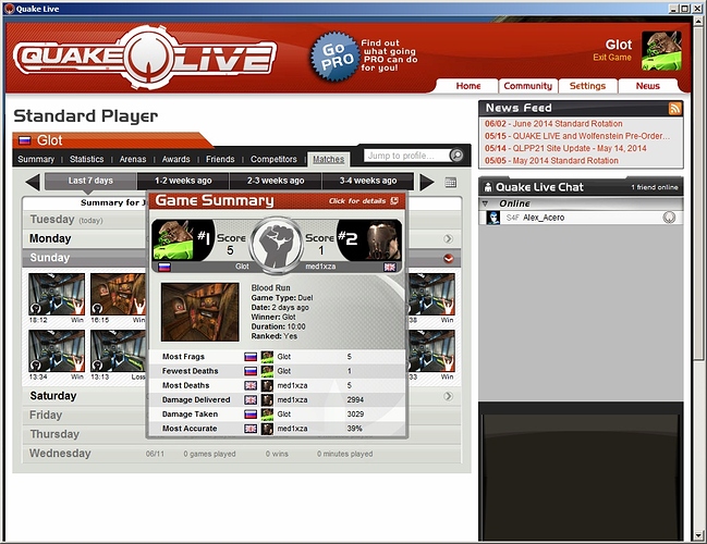 In quakelive you can see every signle match stats that you played during a 4weeks period!