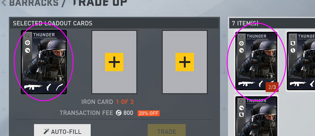 Loadouts- if you have several repeated cards you can only use 1 per trade up.