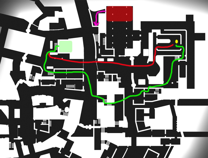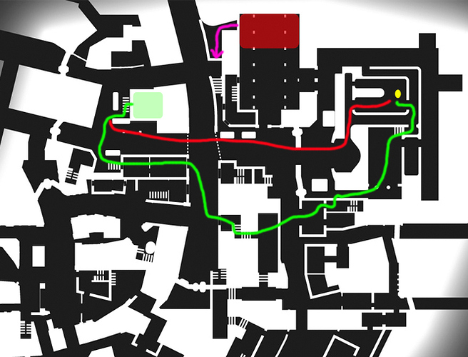 In addition, I like the idea of having to break through the lines, grab the docs and then make a choice - chance going to shorter, more dangerous route (red line - like under bridge run in Goldrush), or go the long, safe route (green line). It’s this arrangement of objective, spawns, and giving the players/doc runner a choice that makes maps more exciting.