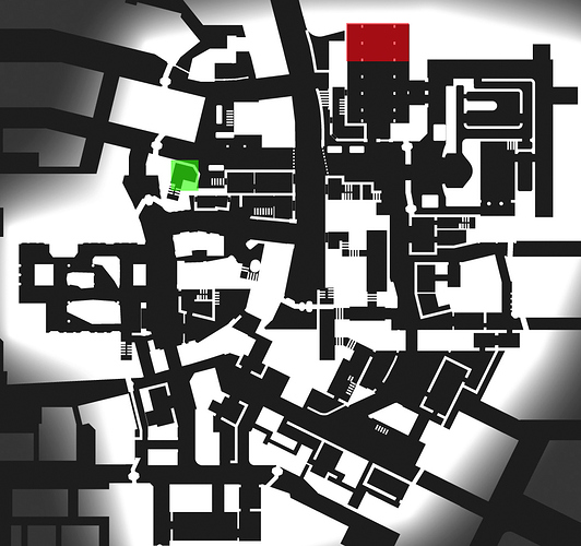 First off, move the defender’s spawn to the garage (red area) and have the doc secure area at a terminal inside the old office building just off the bridge (green area).