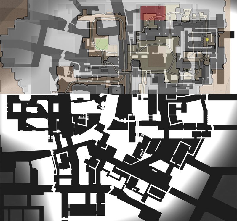 I’ll admit, it is very hard to differentiate between the two maps in the following overlay (and people who have never played Goldrush will be completely lost), but with the change of spawn and the change of place where you secure the docs, this portion of the map would at least resemble Goldrush (with the exception of the docs being in a slightly different place when compared to Goldrush).