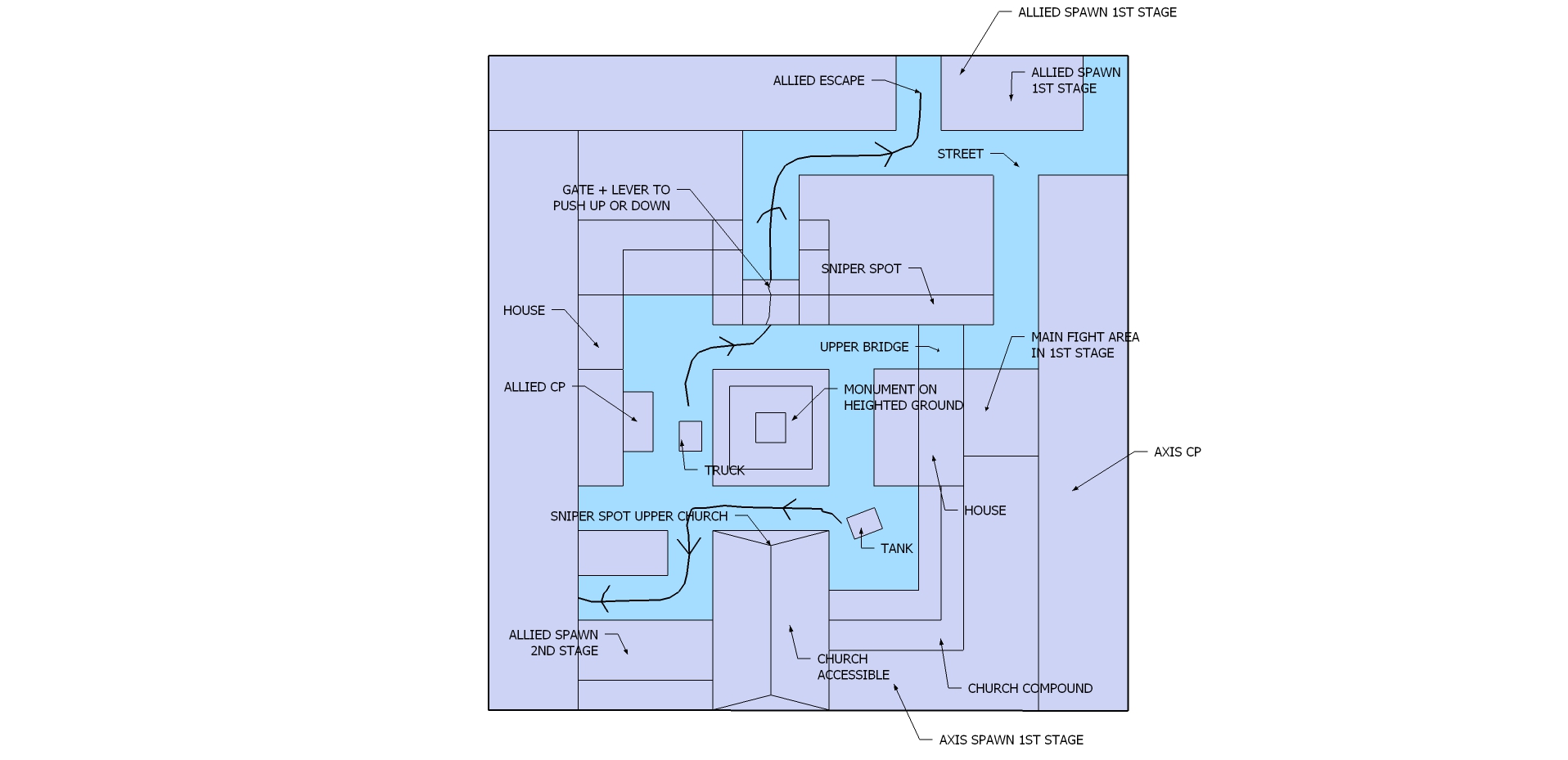 In other words: allies will first try to steal the tank (main battle of 1st stage). Then they escort it to the 2nd stage, where the bank is located (this is indicated by the lines pointing from the tank on some road (this road can change of course). It leads to the left side, where the 2nd stage is going to take place, which is to blow up the bank doors (goldrush style), steal the gold and bring it to the truck in 1st stage (long ‘doc run’ travel time through contested area!). Once loaded in the truck, the truck is to be escorted across the escape road through a gate, which axis can pull down, and allies can pull up with a lever mechanism. This should be interesting. I also plan to make CPs enabling a further spawnpoints and probably will add a few mini constructibles to block paths.