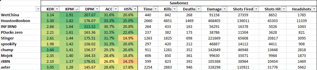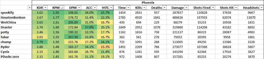 So pre nerf Sawbonez and pre (recent nerf) Phoenix the same 5 players (if inferno played Phoenix I would assume 6) are in the top 10. This is why I disagree with using Echo stats for your balancing right now. There aren’t enough players and their isn’t enough data.