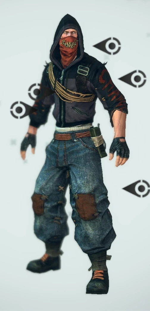 Peirce is a white and tall man with orange hair and brown eyes. He wears a orange vest like the on in this picture and shorts. On his wrist Peirce wears his radiation tracker and in his belt hangs his quiver. While not present in this image Peirce also wears a bandanna over his face with a mouth with sharp teeth is a painted on to cover his damaged face.