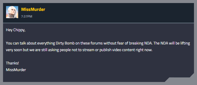 It’s worth pointing out that Dirty Bomb will remain in Closed Beta when the NDA initially lifts. New players will be introduced to the CB, the first time that more than a handful of new players have jumped onboard at any one time in ~ 4 months.