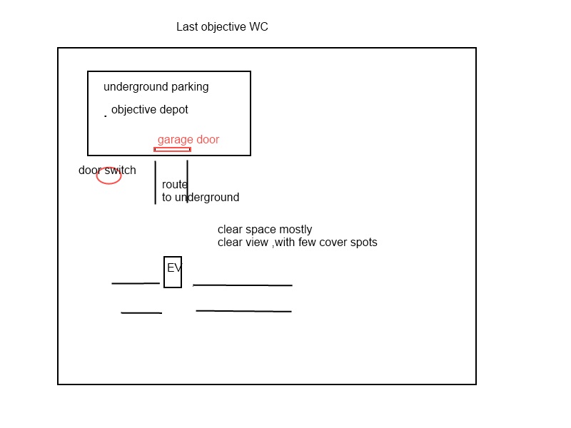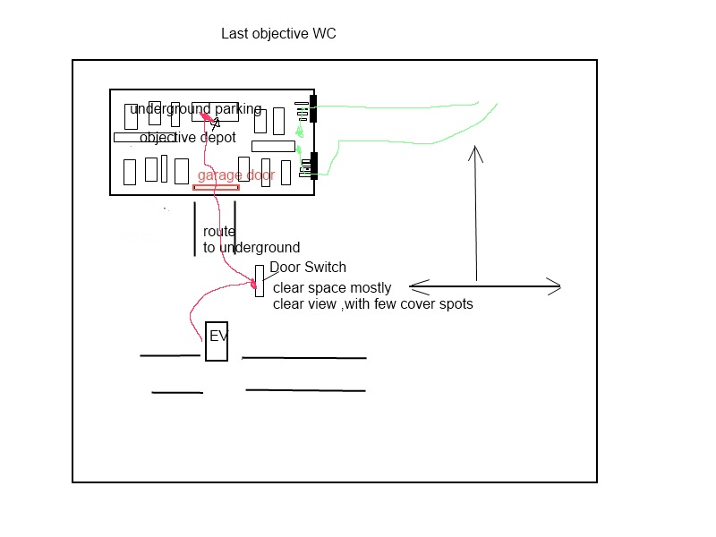 An alternate route for offense allowing them to exit from a one-way accessible drop point. This feels necessary because of how easy it is for defense to initially camp the EV from inside the garage. An aggressive defense should still be viable, however offense should have the opportunity to converge on the point from another angle.