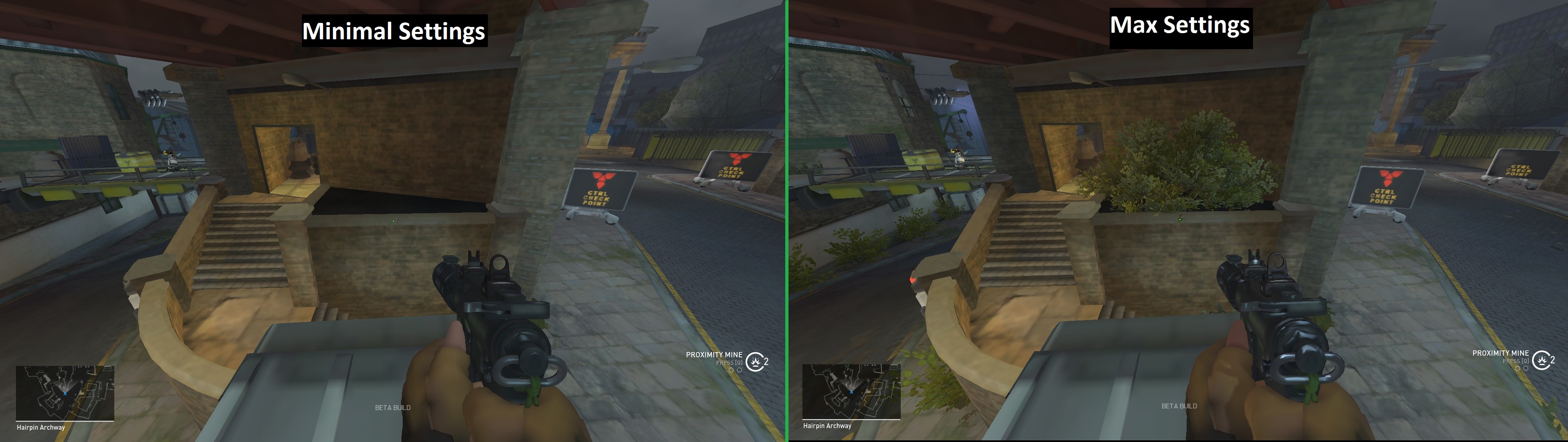 If you set your settings to low (I don’t remember which setting exactly it was) bushes become invisible. I understand that this is made to improve performance but it also gives you an advantage because you have more sight. I don’t think any video settings should give you an actual advantage ingame