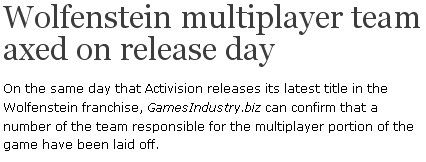 Though I am dragging this slightly off-topic, I agree 100% about the lay-off announcements. Nothing erodes confidence in a product more than firing the team that developed it, the day the game is released. At the very least, it tells the customer that there will be no follow-through support and DLC. At worst, it tells the customer that the publisher itself thinks their game is a PoS.