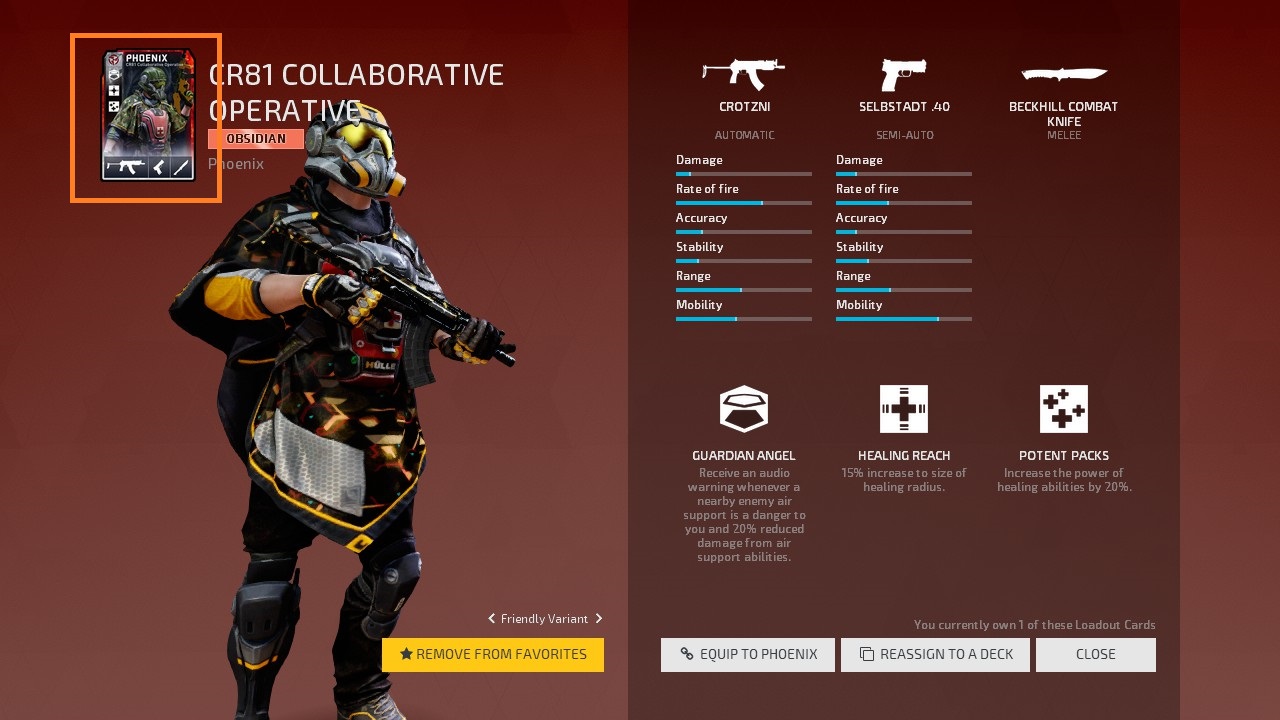 Noticed today that in the various menus (merc decks, loadout cards, skin preview) the Phoenix Obsidian Operative card somehow reverted to the original green camo design. The skin on the model is unchanged, just the card which appears in the menus: