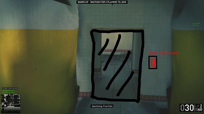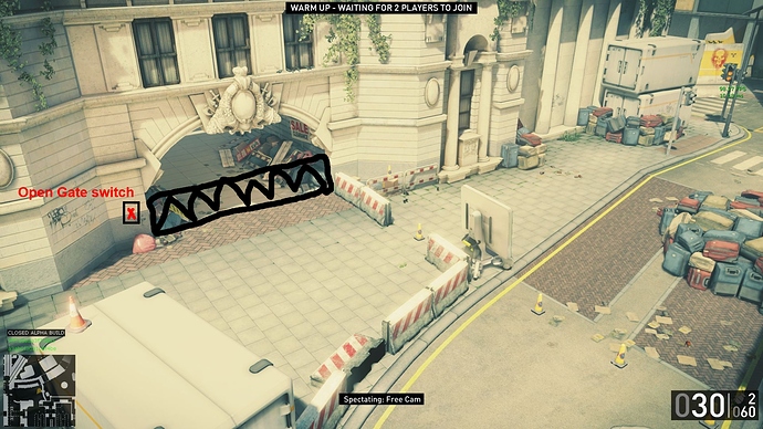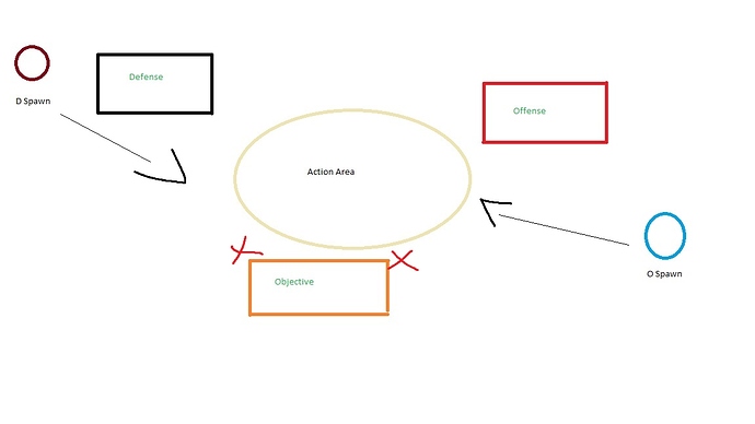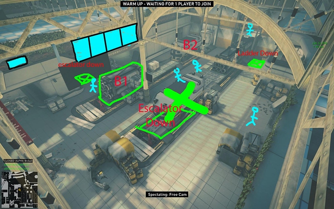 I marked out some potential 5v5 positions that would allow defenders to have good crossfires on all of the entrances and easily be able to rotate between the objectives and one another. It might be that some upper level openings would need to be blocked off; probably just with glass so that you can still see where an attack is coming from. Note: The PDA opening I would close off with clear glass that you can’t shoot through, and the window on the left would be identical to that on the right (that you can shoot through). Anyway this is just one idea for now, and I’ll probably add some other completely different ideas later on.
