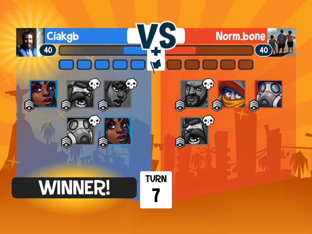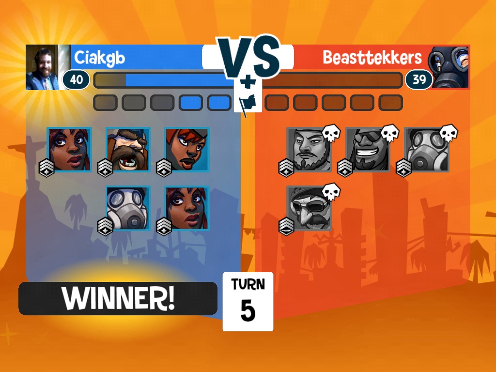 He’s dead now, thank god, tough match. Waiting for him to realize he couldn’t make it to the rocket zone with a jet pack, he’s out of any abilities of any kind, I have four toons to his two, and unless I choke on a chicken bone and fall out of the zone, this is turn five.