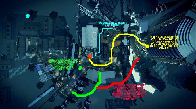 For that particular map, I would love to see the EV stop once it blows open the doors to the Chapel, and then there was a single objective the attackers had to steal at the current secure point, and run it back to the Chapel to secure and some sort of computer terminal/transmit station. This would add new routes, make the doc run much more exciting, and make the Chapel itself relevant again (rather than just a piece of eye-candy).