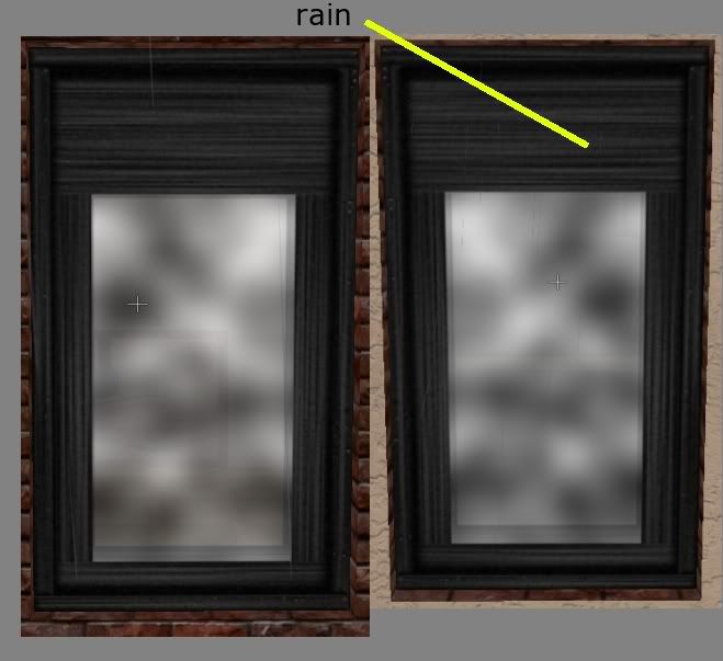 the problem i’m having is that i’m getting rain showing through the parts of the window frame that are supposed to be opaque(window on left as seen from exterior of building - no problem. window on right is same window but from interior of building - rain is visible through the solid portions of the texture):