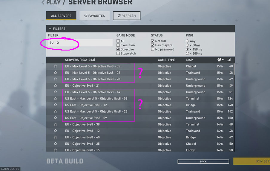 e.g. “EU”+" Objective"-“8vs8”-“Max”-“map:Underground”-“map:Terminal”-“full”-“empty”-“password”