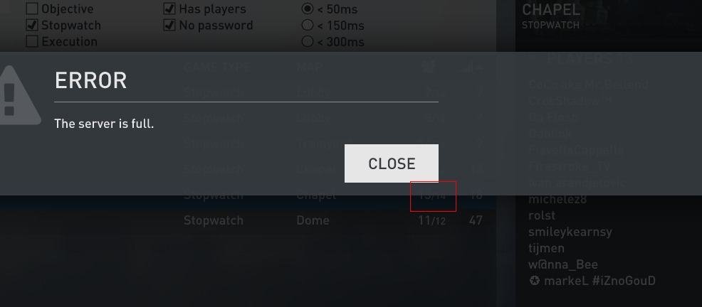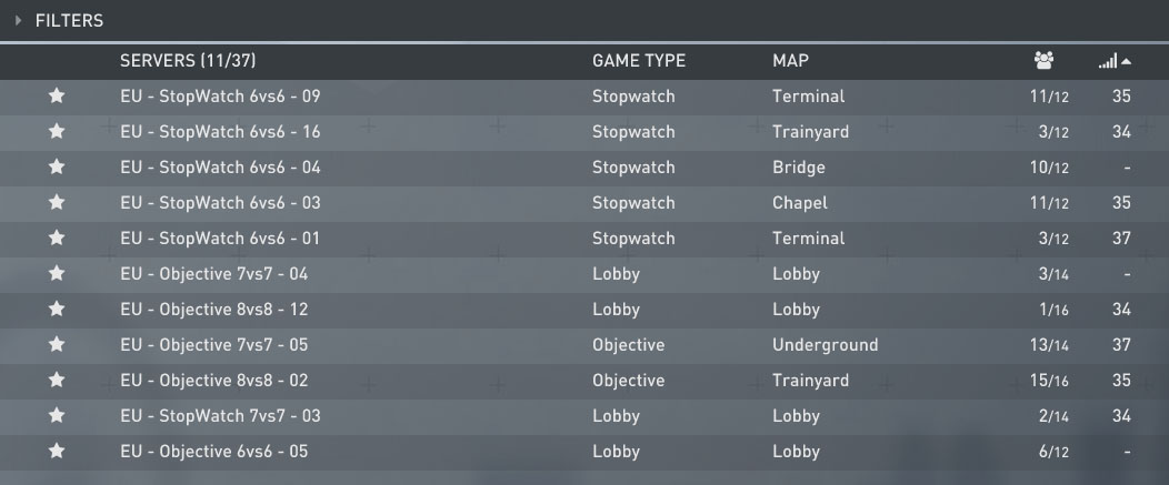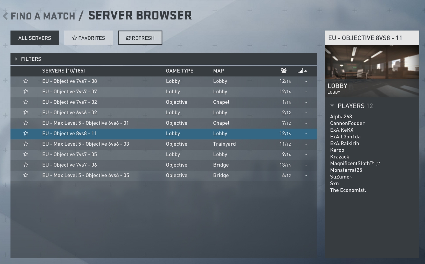 Typically takes around 4-5 servers before one is actually joinable (of the usually around 5 on SW mode which are not empty or ACTUALLY full, or OBJ mode where the first 5 servers that aren’t full / empty are stacked to the gunwales. The alternative is a 12/14 server which always ends up with uneven sides.