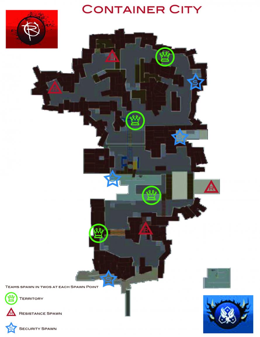 So, Resistance spawns 2 members near the back spawn near the Bio Sample, 2 Security at the opposite side where there’s a little room. 2 Resistance spawn in the Resistance spawn near the bridge and 2 Security spawn at the Health Post. 2 Security spawn where Security Spawns. Etc. The match keeps rotating where you spawn so that you are in a different area when you die. So there are territories thrown in AND objectives to complete.