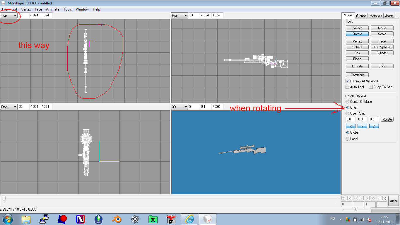 Only thing is that when Milkshape (as I use)import an md3 it comes in the wrong direction and you will have to rotate it to be pointing downwards in the “top” window. remember to tick the origin…better with a pic: