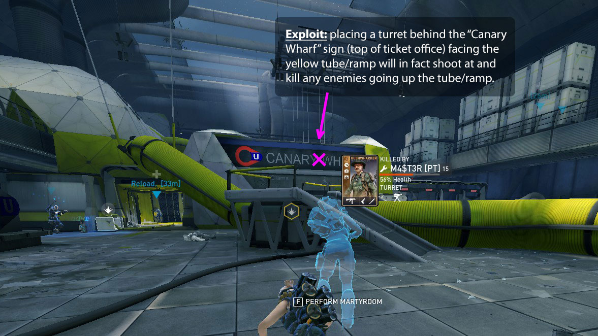 Exploit: placing a turret behind the “Canary Wharf” sign (top of ticket office) facing the yellow tube/ramp will in fact shoot at and kill any enemies going up the tube/ramp.