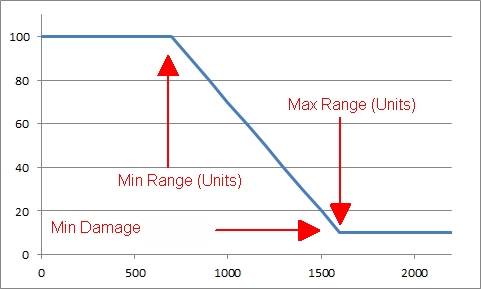 I gather that the min / max damage and range values define the damage falloff curve, but could you give us an idea of it’s shape? Is it something as simple as max damage up to min range then linear reduction to min damage at max range and flat again from there on, or something more elaborate?