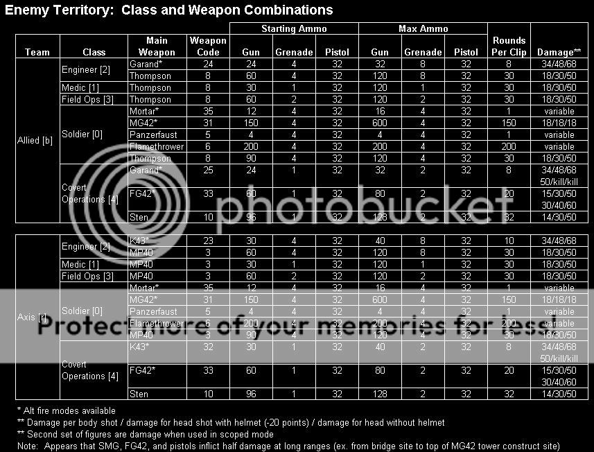 I’ve dug up a simple list of damages at http://www.game-foundation.com/esports/et_weapons.html and another, also with ammo payout info, and class/weapon info at http://img4.photobucket.com/albums/0803/fuelcut/61cdd338.jpg. Some of the numbers there are contradictory: the MG42 apparently does 18 or 20 damage. A couple of pages on spread, one is at http://hallelujah.wolfenstein.ru/rtcw/et/et_spreads.htm.