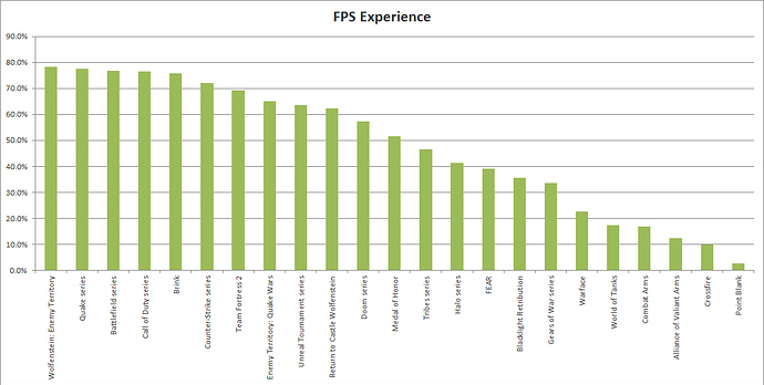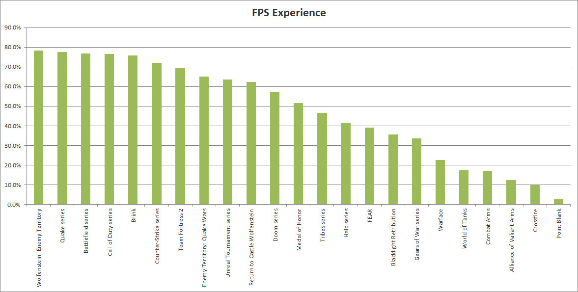 We asked you what other FPS games you had played in the past. You were allowed to tick as many as you wanted. This chart shows the percentage of respondents that had played each title. We had just shy of 400 people reply to the survey.