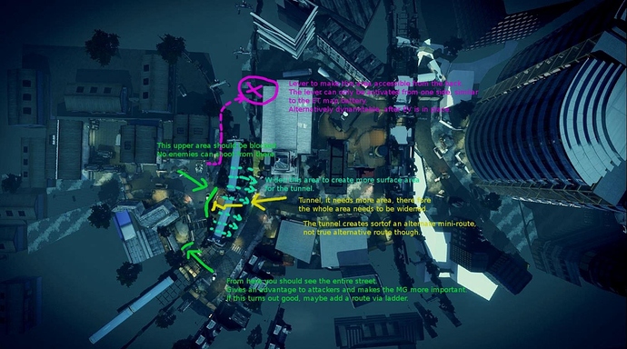 Took gimp and drew some up some ideas i had with the layout on first stage of the map. Main ideas: block out certain areas, add a tunnel, add a lever, widen the map for the tunnel. The way to the lever is entirely optional, it could be anywhere near the church, but also way back from where the EV spawns.
