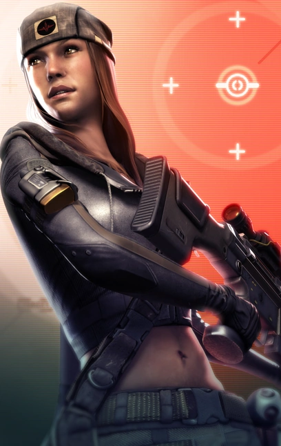 Based on how her pistol and knife are positioned, she should have quick draw as a 4th hidden augment.