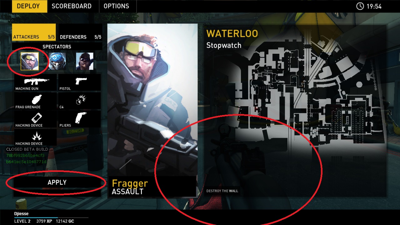 Menu was initially showing Fragger as selected, but I spawned as Phoenix (see hands and weapon at bottom of screen). Going back to the limbo menu, Fragger still showing as selected and cannot force in that selection since apply is unavailable.