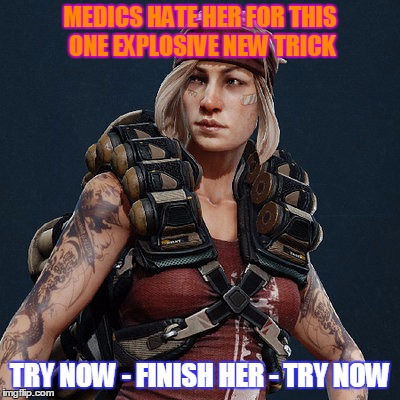 Someone else said that they’d rather watch ads than try to finish nader in a match. I countered with: Medics hate her for this one cool new trick! He cackled so hard I decided to meme it.